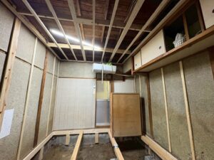 既存の畳を取り外して処分しました。畳を剥がした後の土台が見えています。