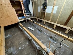 床を支える木材(根太)を新しく組み、コンクリートの束石と調整束で