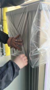 塗らない部分を守るため、養生シートでしっかり保護していきます。
