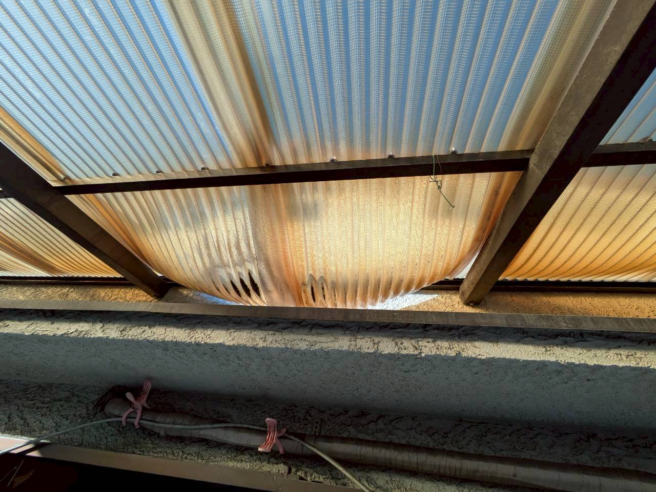 波板が経年劣化により茶色く変色し、透明感もなくなっています。 紫外線や熱で柔らかくなり全体的にたわんでいます。 雨水や自重で変形または 固定部周辺が伸びている可能性も高く、 強風が来たら割れやすい状態です。